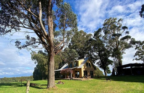 The rammed earth house is beautifully positioned on top of a hill with a majestic Gippsland forest backdrop overlooking unforgettable views facing distant ranges and green pastures where cattle graze.