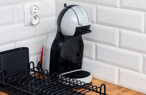 refrigerator with freezer, electric oven, electric kettle, coffee maker (for capsules), toaster, kitchen and tableware