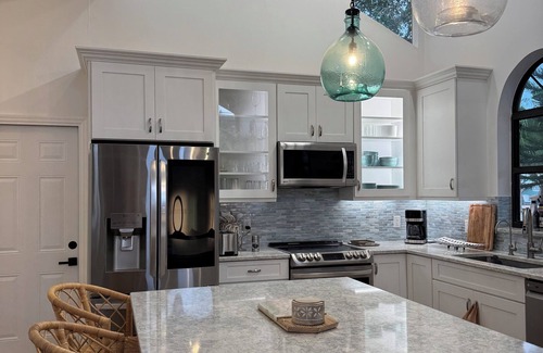 Enjoy an open-concept living room and kitchen with high ceilings, a kitchen island, and upscale finishes. Fully equipped kitchen, smart TV, and board games included.