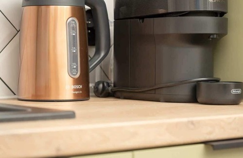 Gas stove, refrigerator with freezer, oven with microwave function, electric kettle, coffee maker (capsule), set of dishes, kitchen utensils, washing machine, table with chairs